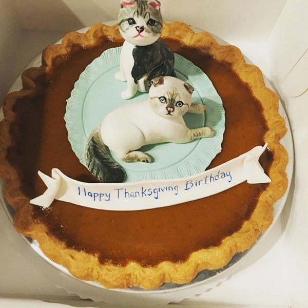 In a since-deleted Instagram post, Taylor shared a photo of the pastry (featuring her beloved cats Meredith and Olivia), with a message on it that reads “Happy Thanksgiving Birthday.”